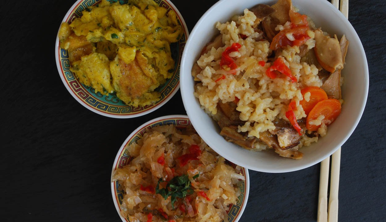 Az alábbi recept egyébként Magyar Elek 1932-ben megjelent Szakácskönyvében lelhető fel. Olvasása közben rögvest keleti illatok úsztak az orromba (igen, igen, olvasás közben érzek illatokat, sőt, hangokat is hallok!): „egy lábosban 20–25 deka rizst párolunk, egy másikban pedig 10–15 deka apróra vágott, friss gombát (szárítottból sokkal kevesebb is elég). Mikor a gomba leve elfőtt, összekeverjük a rizzsel. Kerek tálra tálalva, 3–4 tojásból készített rántottával körítjük és ecetes vagy vizes uborkát adunk melléje. Hústalan ebédre kiválóan alkalmas fogás!”