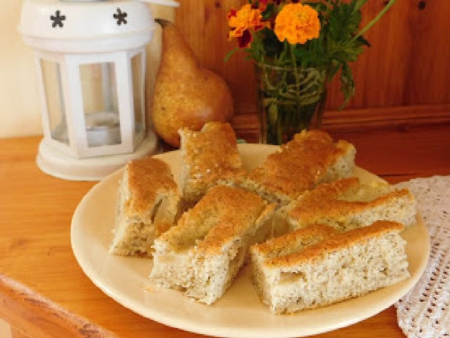 Hozzávalók: 4 tojás, 25 dkg cukor, 25 dkg margarin megolvasztva, 1 citrom leve, héja, 35 dkg liszt, 5 dkg darált mák, 1 csomag sütőpor, 2 evőkanál tejföl, 4-5 körte. Így készült: a tojásokat, cukrot elkevertem, majd belekerült sorra a többi hozzávaló, sima masszát kevertem belőle. Tepsibe borítottam, tetejét kiraktam megpucolt, felszeletelt körtével. 180 fokos sütőben tűpróbáig sütöttem. Finom, puha sütemény lett belőle. (http://gerdisuti.blogspot.ro)