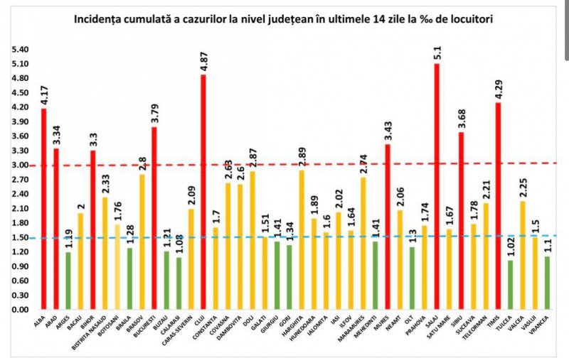 A hétfői adatok szerint csupán az ország tíz megyéjében (Argeș, Brăila, Buzău, Călărași, Girgiu, Gorj, Mehedinți, Olt, Tulcea, Vrancea) nem lenne kötelező a maszk kültéri viselése, ezekben ugyanis a fertőzöttségi ráta 1,5 ezrelék alatt van.