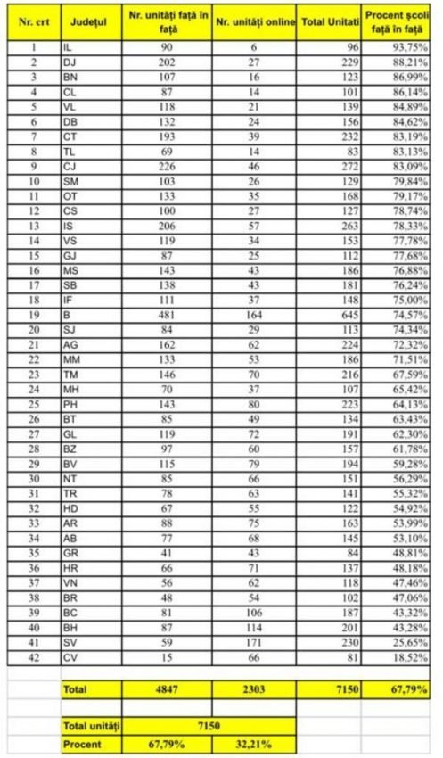 A skála másik végén Ialomița megye áll, ahol a 96 iskolából mindössze 6-ban tartanak online órákat, tehát az oktatási intézmények 93,75 százalékában fizikai jelenléttel zajlik az oktatás.