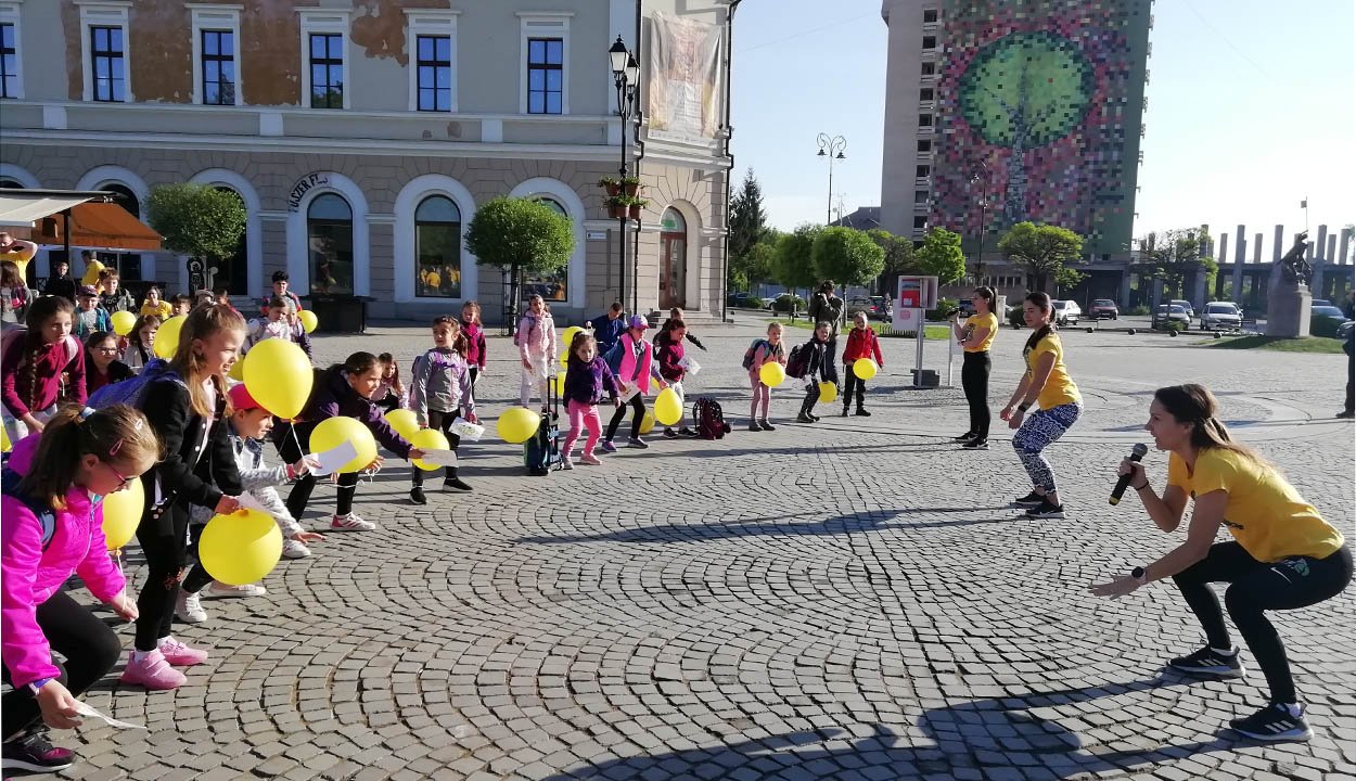 Több száz gyermek, diák, önkéntes és szülő jelent meg tegnap reggel a főtéri Sepsi feliratnál, hogy megünnepeljék az együtt töltött elmúlt egy évet, amióta működik a Lábbusz program Sepsiszentgyörgyön. A szervezők sárga lufikkal, az alkalomra sütött muffinnal, zenével, reggeli átmozgató tornával és jókedvvel várták az érdeklődőket.