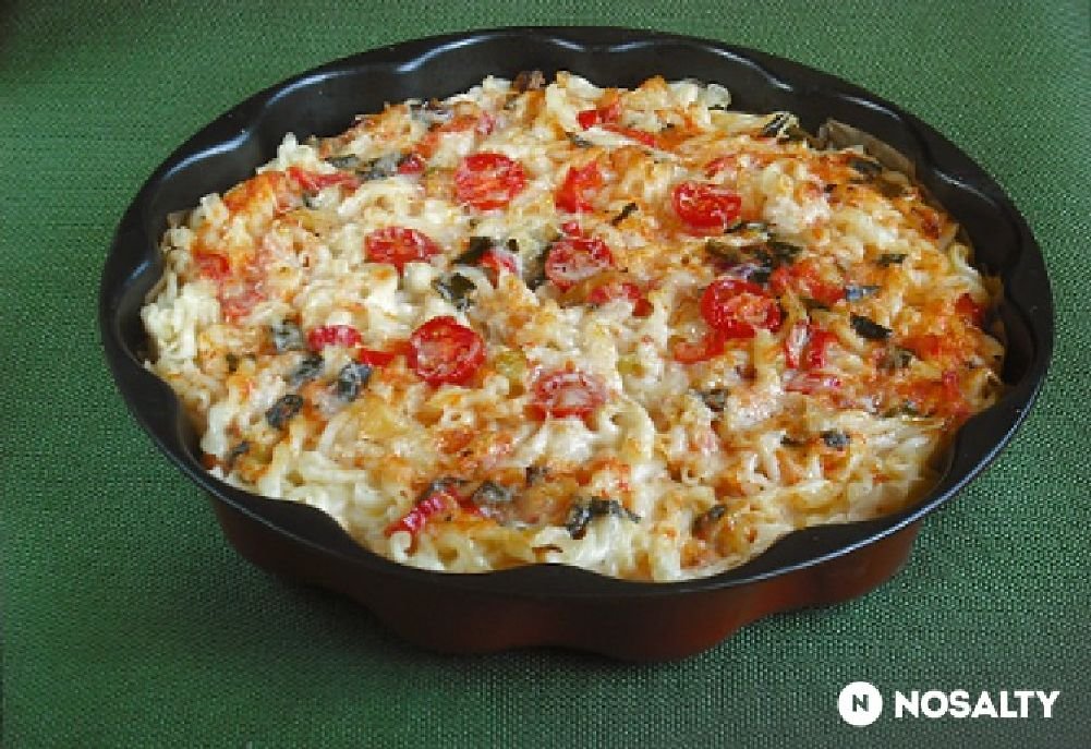 A tésztát sós vízben megfőzzük. A hagymát és a paprikát előkészítjük, apróra vágjuk, fedő alatt olajon megpároljuk. Amikor már majdnem kész, hozzáadjuk a felaprított paradicsomot, zúzott fokhagymát, és fűszerezzük. Elvegyítjük a megfőtt és leszűrt tésztával, a rámorzsolt túróval, tűzálló tálba töltjük, és rászórjuk a reszelt sajtot. Díszíthetjük félbevágott szendvicsparadicsommal, és előmelegített sütőben 20–25 perc alatt megsütjük. (www.nosalty.hu)