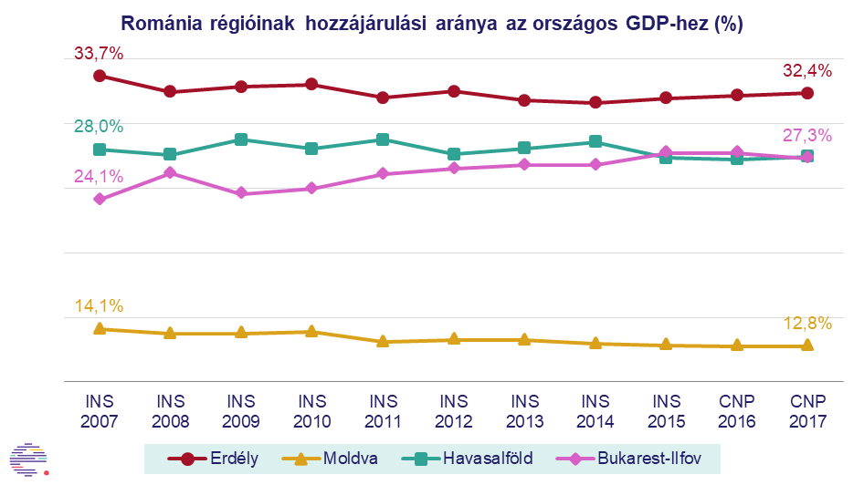 Az országon belül Bukarest és a közeli régió súlya jelentősen nőtt, míg Erdély gazdasági teljesítménye enyhén, Moldváé pedig jelentős mértékben csökkent. Míg 2007-ben a Bukarest-Ilfov régió az országos GDP 24%-át tette ki, ez 2017-re 27%-ra emelkedett, ugyanebben az időszakban Erdély GDP-hozzájárulása 34%-ról 32%-ra csökkent.