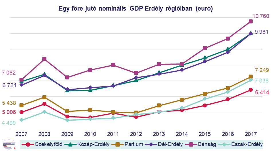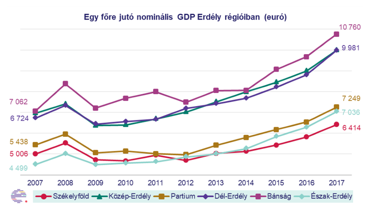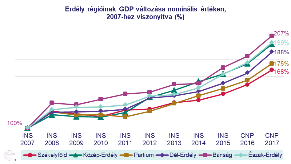 Erdélyen belül a székelyföldi és a partiumi régió mutat számottevő lemaradást, itt a gazdasági növekedés lassúbb ütemű volt. 2007 és 2017 között a GDP-növekedés Bánságban volt a leghangsúlyosabb, 207%-os. Észak- és Közép-Erdélyben átlagosnak mondható a bővülés, 199, illetve 197%-os. Mind a romániai, mind pedig az erdélyi átlag alatt teljesített Dél-Erdély, 188%-os növekedéssel 2007-hez képest. Partium és Székelyföld gazdasági erősödése jelentősen elmaradt az országos és regionális trendekhez képest, 175, illetve 168%-os bővüléssel.