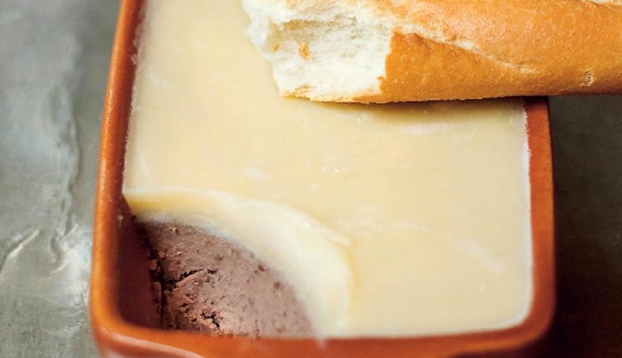 Hozzávalók: 40 dkg szárnyas máj, 5 dkg bacon, 1/2 fej hagyma, 2 gerezd fokhagyma, 4 szál petrezselyemzöld, 0,3 dl konyak, 14 dkg vaj, 1 csipet majoránna, 1 csipet kakukkfű, 4 db babérlevél, só, bors.