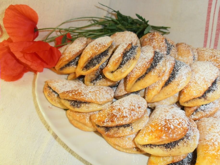 Hozzávalók a tésztához: 50 dkg liszt, 1 csomag sütőpor, csipet só, 25 dkg margarin, 50 dkg túró, 2 tojássárgája, 1–2 evőkanál tejföl. A töltelékhez: 15 dkg darált mák, 15 dkg porcukor, 2 tojásfehérje, 2 evőkanál lekvár (meggy, vagy más savanykás), 1 evőkanál gríz. A tetejére: 1 tojássárgája, pici tej, porcukor.