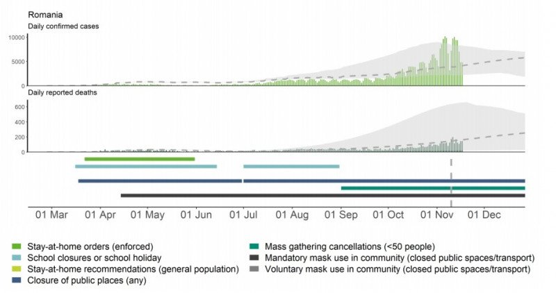 Románia esetében az előrejelzés az mutatja, hogy a megbetegedések és az elhalálozások száma egészen karácsonyig emelkedni fog, amennyiben csak a jelenlegi korlátozások maradnak érvényben.