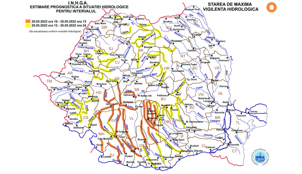 A hidrológusok szerint vasárnap délután 4 órától hétfő déli 12 óráig nagy mennyiségű víz árad le a patakokon, lejtőkön és vízfolyásokon, villámárvizek alakulhatnak ki, és a vízállás meghaladhatja a másodfokú készültségi szintet a következő folyók vízgyűjtő medencéjében: Maros (Fehér, Szeben és Hunyad megye), Cserna (Gorj és Krassó-Szörény megye), Duna (Mehedinţi és Krassó-Szörény megye), Drincea (Mehedinţi megye), Desnăţui (Mehedinţi és Dolj megye), Zsil (Hunyad és Gorj megye), Gilort (Gorj megye), Motru (Gorj és Mehedinţi megye), Zsil (Dolj megye), Olt (Brassó, Szeben, Vâlcea, Olt, Argeş, Gorj és Dolj megye), Vedea, Teleorman (Argeş és Olt megye), Argeş (Argeş megye).