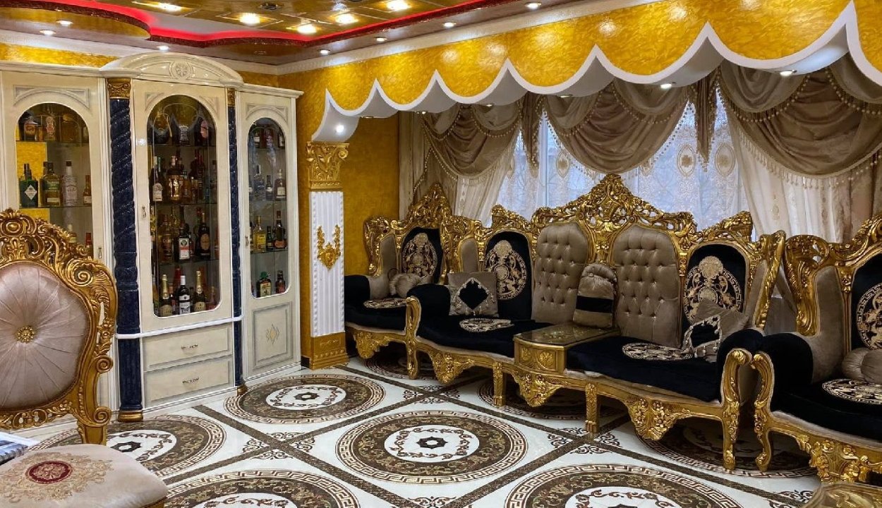 A hirdetésben az áll, a lakberendezés a klasszikus keleti stílust követi, barokk stílusú bútorokkal és keleti színvilággal – olvasható a helyi sajtóban. Így talán nem meglepő, hogy trónok, neonfények, rengeteg arany és giccses kiegészítő található a lakásban, ugyanakkor nem maradhattak ki a világhírű divatmárkák kiegészítői sem.