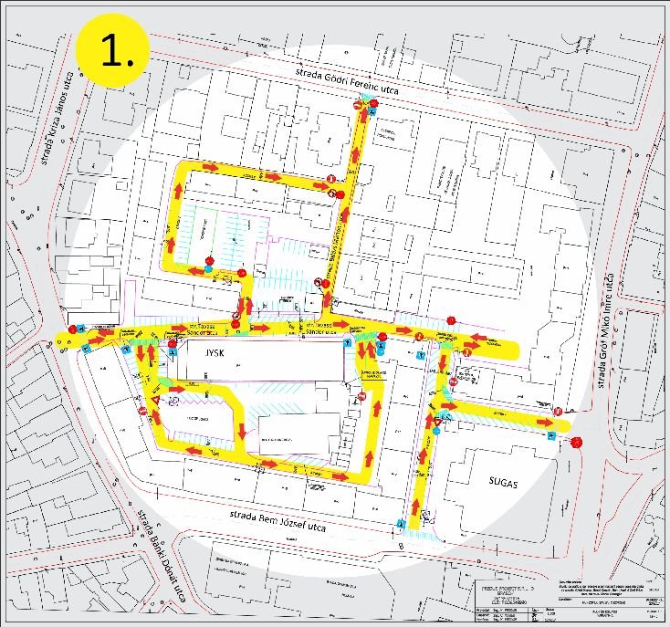 A Gróf Mikó Imre, Gödri Ferenc, Bánki Donát és Bem József utcák által határolt területen felvázolt megoldás szerint a Tavaszi Sándor utca nagy része egyirányúvá válik, ezzel elkerülhető lesz a Jysk üzlet melletti torlódás. Az első változat szerint a Bánki Donát utcából be lehet hajtani a tömbházak által határolt részre és ki is lehet jutni, de csak azoknak, akik a Jysk parkolójában (játszótér körül) állnának meg. A Tavaszi Sándor utcából a kijárat a Gödri Ferenc utcába és a Gróf Mikó Imre utcába is lehetséges.