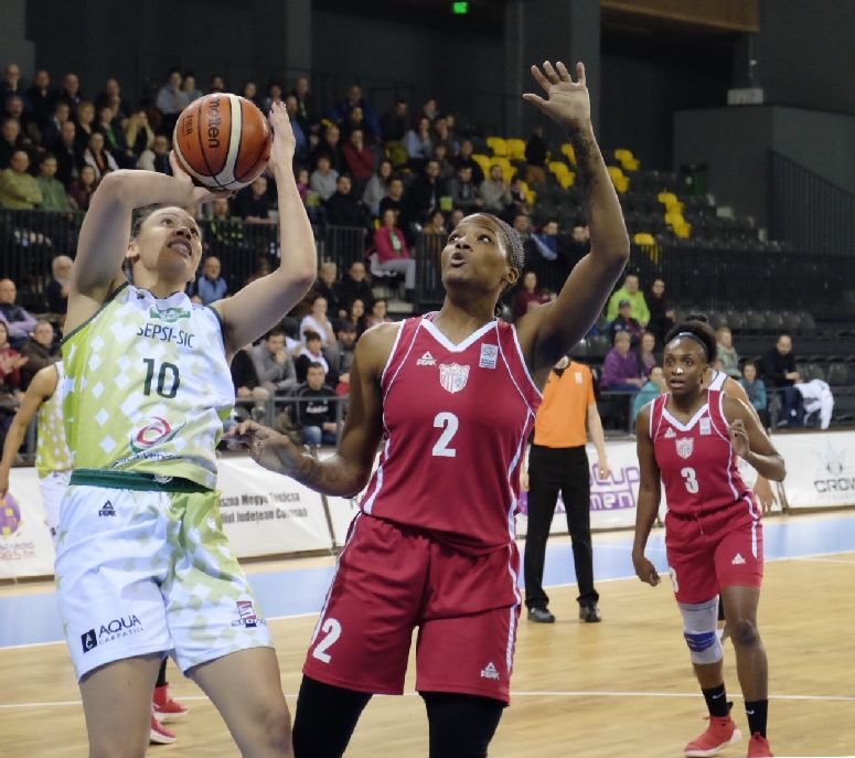 A 21 éves Teodora Neagu háromszor talált be a hárompontos vonal mögül, a palánk alatt Danielle Hamilton-Carter is problémát okozott a Marius Dobă irányította vendégcsapatnak. A szentgyörgyiek a második játékrész elején tovább növelték előnyüket, a 16. percben már 28 ponttal vezettek. Az ellenfélnek a szünetig sikerült faragnia hátrányából, többnyire a zöld-fehérek egykori játékosa, Taneisha Harrison teljesítményének köszönhetően, aki 11 pontot dobott (46–25).