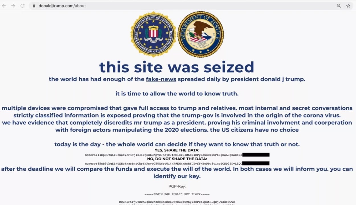A Politico című lap információi szerint a kiberbűnözők azt állították, hogy olyan bizalmas információkhoz jutottak a honlapról, melyek azt bizonyítják, hogy az amerikai elnök "érintett a koronavírus-járvány eredetében", és együttműködik "a 2020-as választásokat manipuláló külföldi szereplőkkel".