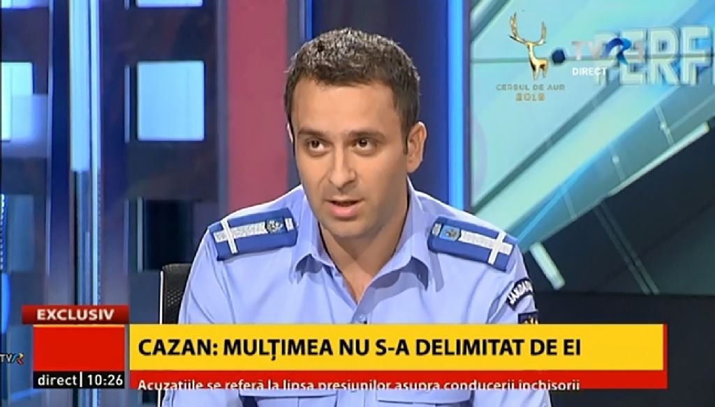 A tiszt a román állami televízió (TVR) adásában azt nyilatkozta, a téren volt egy több száz emberből álló „kemény mag”, és ezúttal a tömeg nem határolódott el a szélsőségesektől, így estek áldozatul az embe­rek a csendőri erőszaknak. Az őrnagy bocsánatot kért azoktól a békés tüntetőktől, akik sérüléseket szenvedtek a csendőrség nem túl finom beavatkozása következtében. Állításának ellentmondani látszik az, hogy a videofelvételek ezrein jól látszik, hogy a csendőrök nem a tér egyetlen pontjára koncentráltak, hanem mindenhol ütlegelték az embereket, így kaptak atyait turisták, taxisok és sajtósok is.