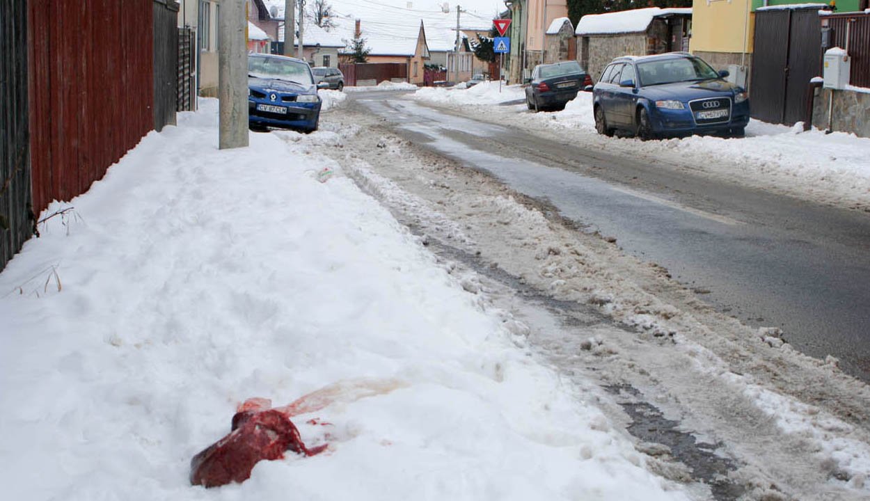 Tegnap arról értesültünk, hogy a sepsiszentgyörgyi Kender utca városközpont felőli részén (képünk) egy nyúzott – feltehetőleg – kutya teteme éktelenkedik a járdán. A helyszínre siettünk, és értesítettük az illetékeseket is, aki csakhamar el is szállították.