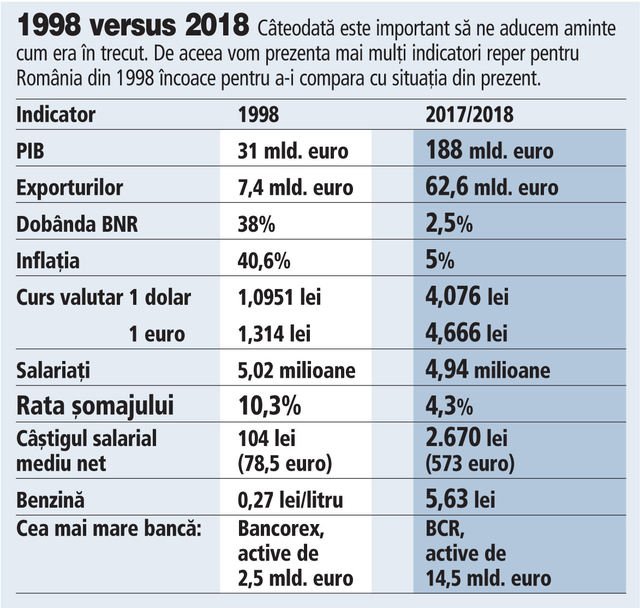 20 éves születésnapját ünnepli idén a Ziarul Financiar pénzügyi napilap, ennek apropóján pedig összehasonlítást készítettek Románia 1998-as és 2018-as gazdasági helyzetéről. Az adatokból az látszik, hogy bár gyakran úgy érezzük, hogy az ország nem lép előre, húsz év viszonylatában mégis jelenetős a gazdasági fejlődés mértéke.