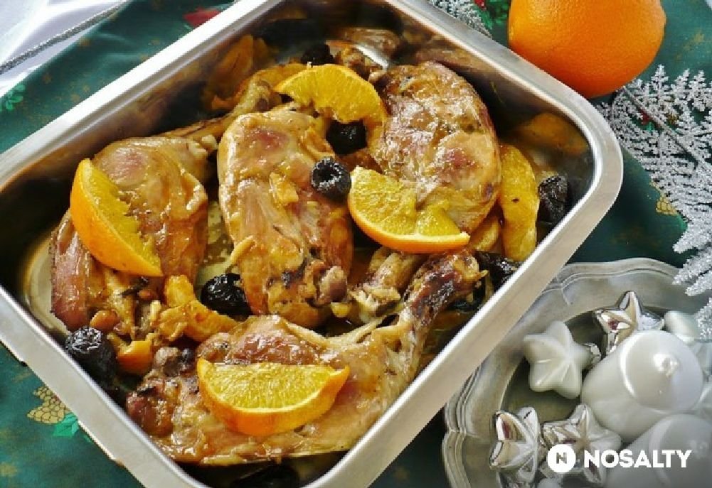 A megtisztított combok mindkét oldalát sózzuk, borsozzuk, és helyezzük egy kiolajozott tepsibe. A mézet keverjük ki egy narancs kifacsart levével, és locsoljuk meg a combokat a felével. Tegyük hozzá a fokhagymagerezdeket, takarjuk le alufóliával, majd rakjuk hűtőbe kb. 1 órára pácolódni. Előmelegített, 180°C-os sütőben pároljuk letakarva kb. fél óráig, ezután vegyük le a fóliát, kenegessük át a combokat a mézes narancslével, tegyük hozzá a narancsgerezdeket és az aszalt szilvát. Sütés közben párszor kenegessük még meg a maradék mézes narancslével, és süssük szép pirosra. (www.nosalty.hu)
