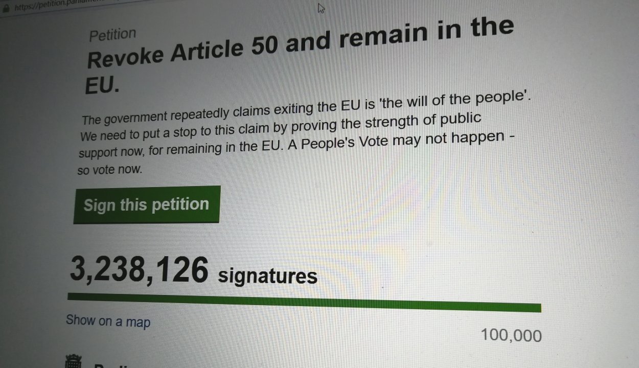 Több mint hárommillióan írták alá péntek délutánig azt a minap megjelent hivatalos petíciót, amely a brit EU-tagság megszűnéséhez (Brexit) vezető folyamat leállítását követeli.
