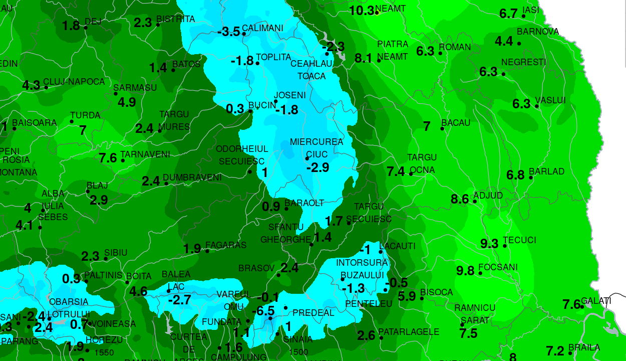 Cristina Blaga, a szebeni regionális meteorológiai központ meteorológusa arról tájékoztatta az Agerpres hírügynökséget, hogy fagypont alatti értékeket mértek Maroshévízen és Gyergyóalfaluban is - mindkét településen mínusz 1,8 Celsius-fokot.