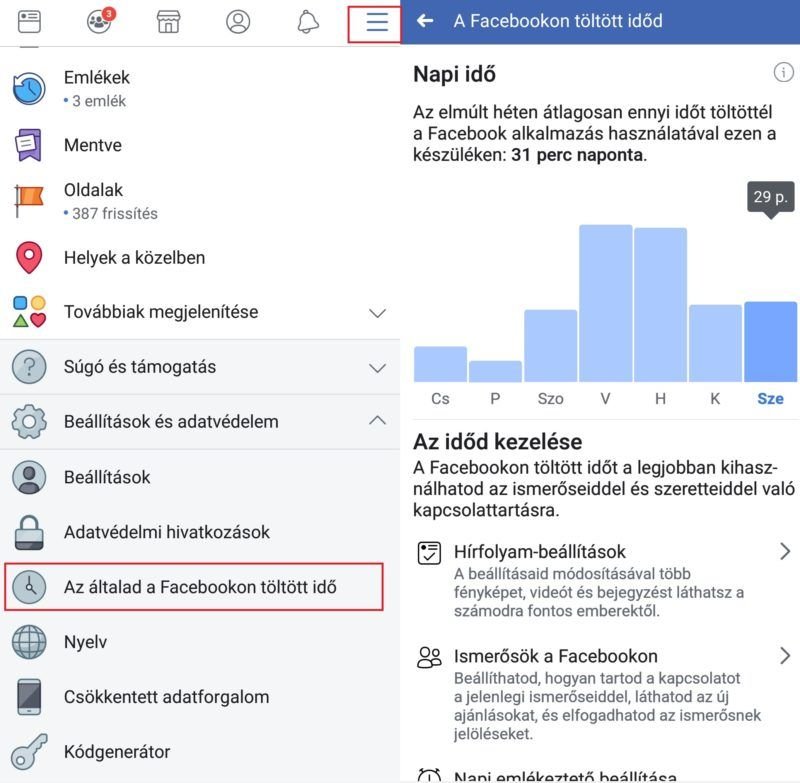 "A Facebookon töltött időd” funkciót a profilunk beállításait jelző három vonalt ábrázoló ikonnal lehet előhívni az ablak jobb felső sarkából.