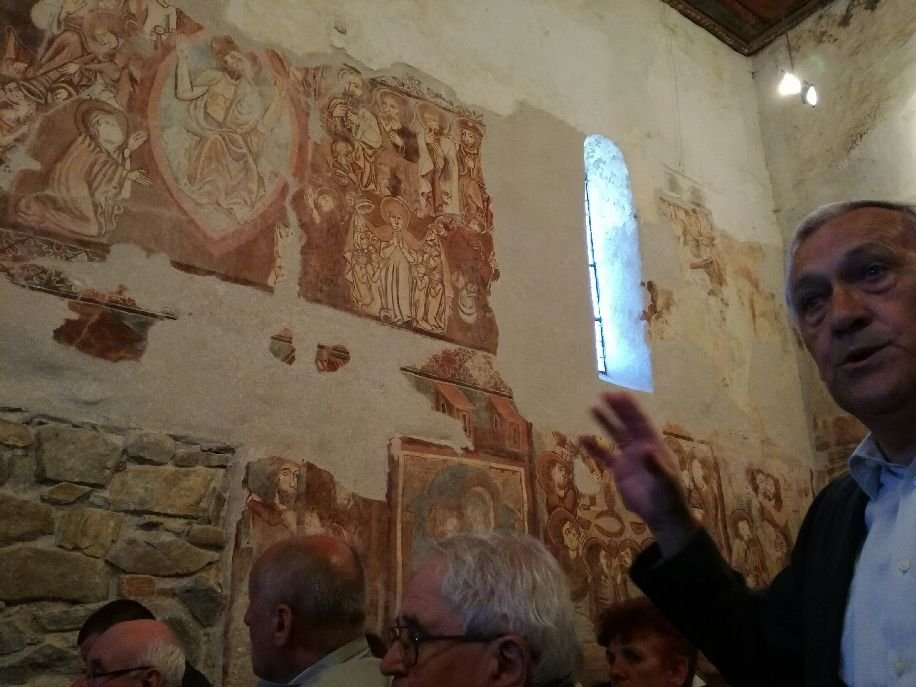 Az 1300-as évek végén épült templom történetéről, kiemelten a 15. század elején készült, már a reneszánsz érintését mutató freskókról Jánó Mihály művészettörténész tartott előadást, aki Kónya Ádámmal együtt több mint 30 éve szorgalmazta a kommunista időkben még a romos állapotban lévő templom megőrzését, majd felújítását és a falfestmények restaurálását. Előadásában Jánó a román kori, de többször átépített templom gótikus kőfaragványok finomságát méltatta, majd eleinknek azt az erőfeszítését is, amivel sokszor erdeik árán toldották-foldozták az 1802-es földrengésben erősen megrongálódott templomot. 1855-ben Huszka József tárta fel a levakolt freskókat, akvarellmásolatokat is készített róluk, de azután újra levakolták őket.