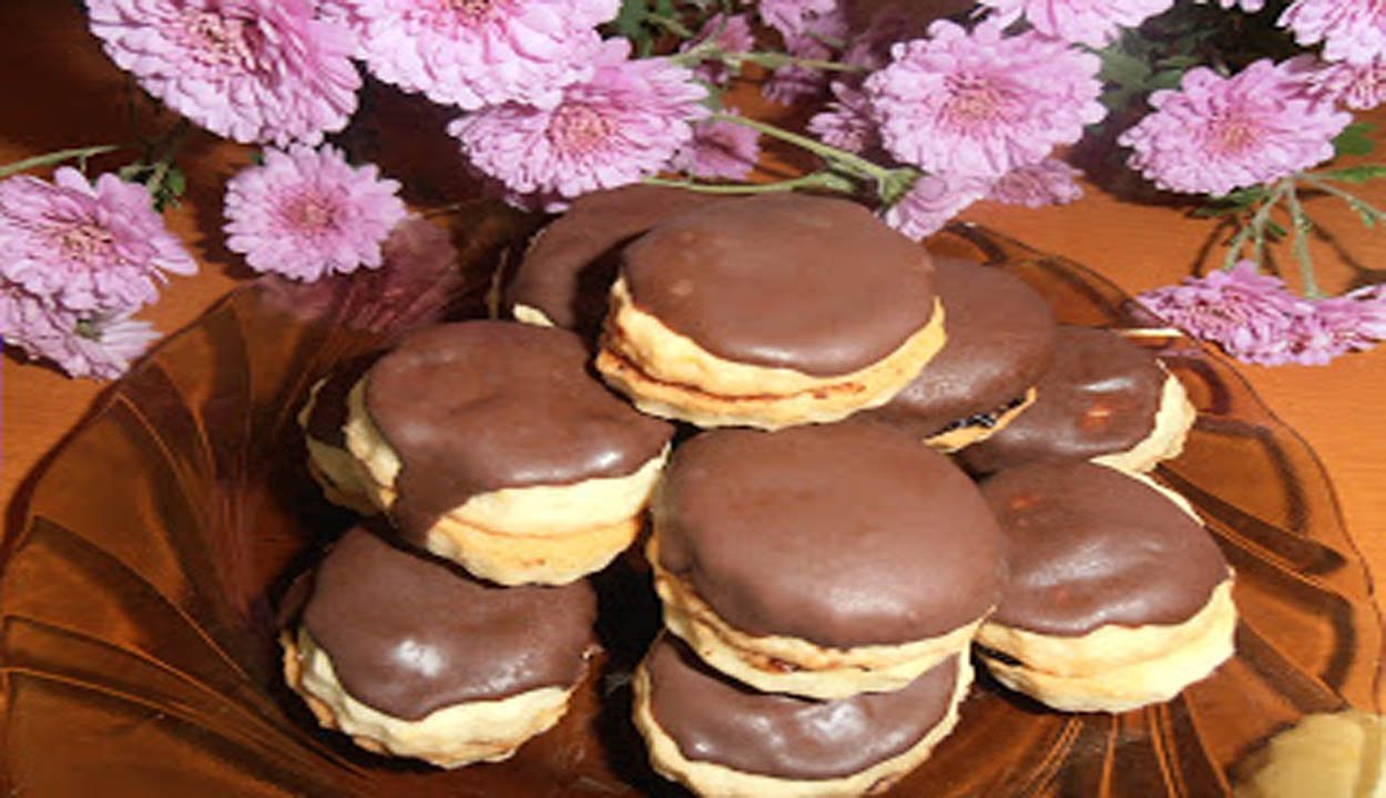 Így készült: elmorzsoltam a lisztet, sütőport, cukrot a margarinnal. Hozzáadtam a tojást, narancshéjat, tejfölt. Tejfölt csak apránként, mert én egyből beletettem a 2 evőkanállal, s kicsit lágy lett a tészta, ezért még kevés lisztet gyúrtam hozzá. Tehát szükséges mennyiségű tejföllel összegyúrjuk. A tészta kemény kell legyen, s nem ragacsos. 2-3 órás pihentetés után enyhén lisztezett deszkán újra átgyúrtam. Vékonyra nyújtottam, kerekre szaggattam. 175 fokra előmelegített sütőben világosra sütöttem. Mikor kihűlt, párosával, lekvárral összeragasztottam. Én málna-ribizli lekvárt használtam, de másmilyen is használható. A csokit gőz fölött az olajjal felolvasztottam. A sütiket lekentem vele, aztán rájöttem, szebb lesz, ha belemártom. Egyenletesebben eloszlik a csoki a tetején. (http://gerdisuti.blogspot.com)