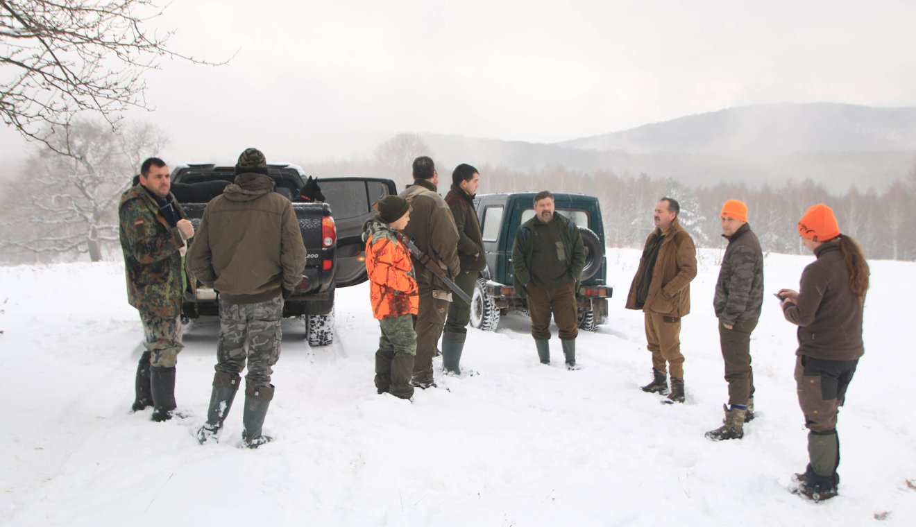 Csendben léptünk egymás nyomába, elől a vadászmester törte a nyomot a hóban, időközönként megállt, megfordult, kezét felemelte, ujjaival jelezte, hogy hányas sorszámú következik, és hogy az hová álljon. Már reggel a gyülekezésnél kihúzták a sorszámokat egy kalapból, ez alapján állják le a vadászterületet. A vadászmester újra megállt, kezéről leolvastuk, hogy az ötös sorszámú következik, vagyis mi, majd felmutatott a domb irányába, ezután megfordult, és vonult tovább a többiekkel a havas tájba. A sorból kiváltunk Máthé Árpáddal, Árkos polgármesterével, majd a domboldalnak vettük az irányt, hogy egy megfelelő állást keressünk, ahonnan jól belátható a völgy és a túloldal, ahonnan jön a hajtás.