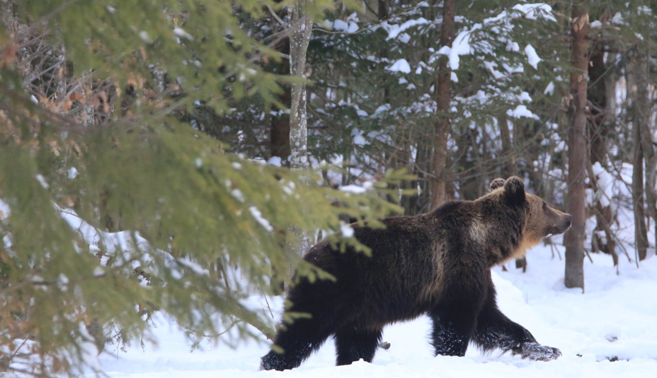 A szajkó már mesze járt, amikor a kutyák a fenyvesfolthoz értek. Ugattak. Ilyenkor, a kutyák ugatásából a vadászok már tudják, hogy medve-e vagy disznó, amit fognak. Árpi felém fordul, a szájáról leolvasom: medve. Azonnal izgalomba jöttem, úgy döntöttem, filmezek, és a legnagyobb örömömre a fenyők alól tényleg egy medve bukkant fel, majd még kettő. Ekkor már bizonyos volt, hogy egy anyamedve és két megtermett bocsa indult neki a völgynek. Kamerázom, látom, hogy jó felvétel sikeredik. A medvék a völgybe értek, és azon a nyomon ment elől az anyamedve, utána a két bocs, ahol nemrég az őzek szaladtak fel a dombon.