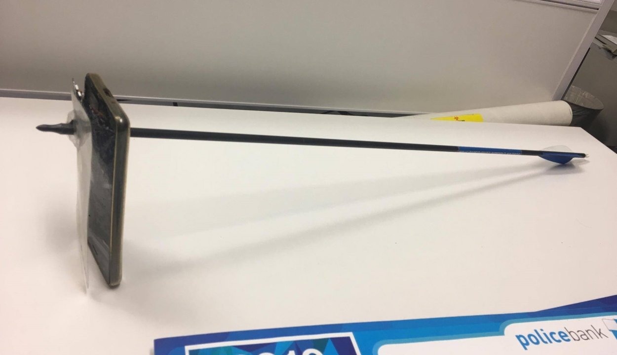 Az áldozat nagy szerencséje, hogy a mobiltelefonja felfogta a nyílvesszőt. De még így is kisebb sérülést szenvedett az állán.