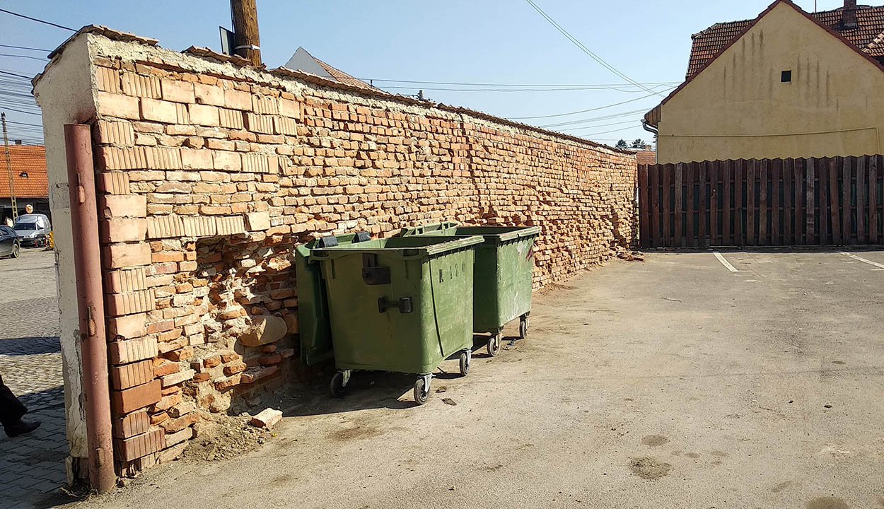 Az útról vagy a járdáról a még egyben levő vakolat miatt nem tűnik fel, hogy mennyire veszélyes Kézdivásárhelyen az egykori székely katonanevelde baloldali szárnya folytatásában levő masszív téglakerítés, viszont a fizetéses parkolóból azonnal látszik a probléma.