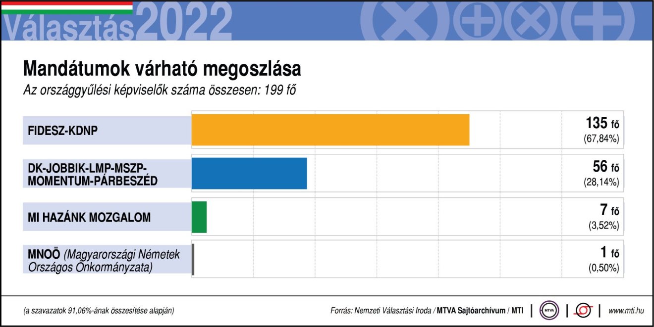 A leadott szavazatok 91,06 százalékának összesítése után a pártok parlamenti mandátumainak száma a Nemzeti Választási Iroda adatai szerint:
