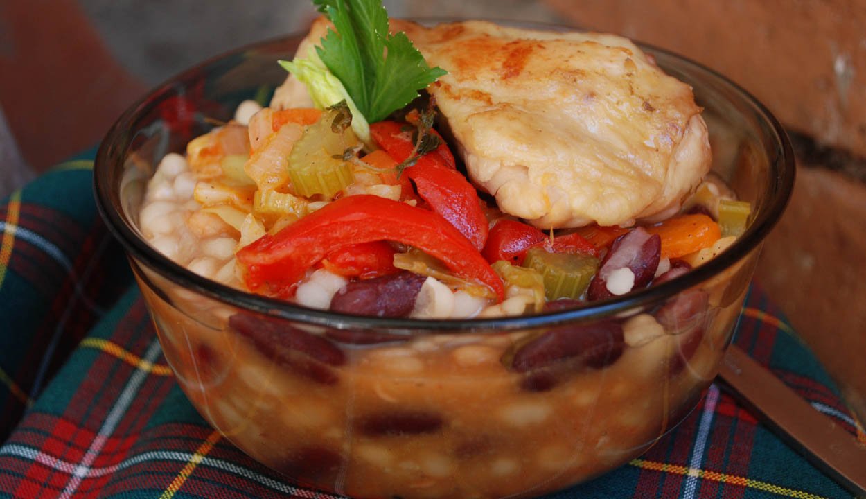Hozzávalók: 20 dkg szárazpaszuly, 60 dkg marhahús (böjtben helyettesíthetjük gombával), 5 dkg szalonna, 1 hagyma, 2 cikk fokhagyma, fél dl paradicsomlé és ugyanennyi vörösbor, 2 murok, 2 petrezselyem, 1 kis zeller, 30 dkg krumpli, 2 babérlevél, 1 tk. köménymag, 1 tk. szárított majoránna, só és őrölt bors.