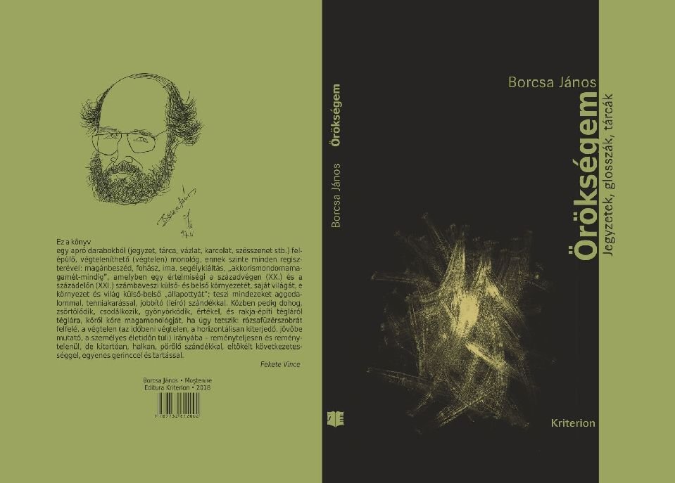 A napokban hagyta el a nyomdát dr. Borcsa János Örökségem című új kötete (képünk). A kolozsvári Kriterion Könyvkiadó gondozásában megjelent munka a Kézdivásárhelyen élő szerző tizenegyedik önálló kötete, amely jegyzeteket, glosszákat, tárcákat tartalmaz. A hét ciklusba sorolt 144 írás nagyrészt az utóbbi négy esztendő alatt keletkezett, és négy kivételével lapunkban, a Székely Hírmondóban jelent meg.