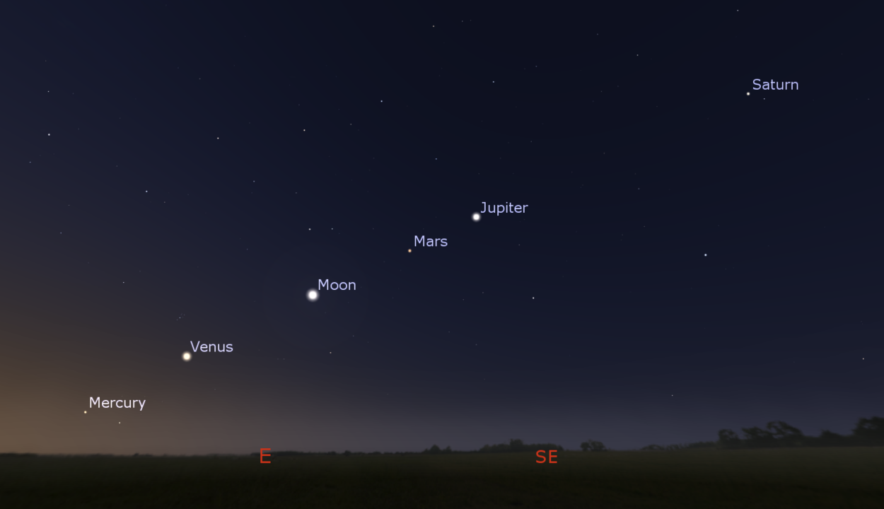 Az eget fürkésző koránkelők számára, akik akadálytalanul látják a horizontot kelet és délkelet felé, a Merkúr, a Vénusz, a Mars, a Jupiter és a Szaturnusz válik láthatóvá, mielőtt a leghalványabb, a Merkúr eltűnik majd a felkelő Nap fényében.