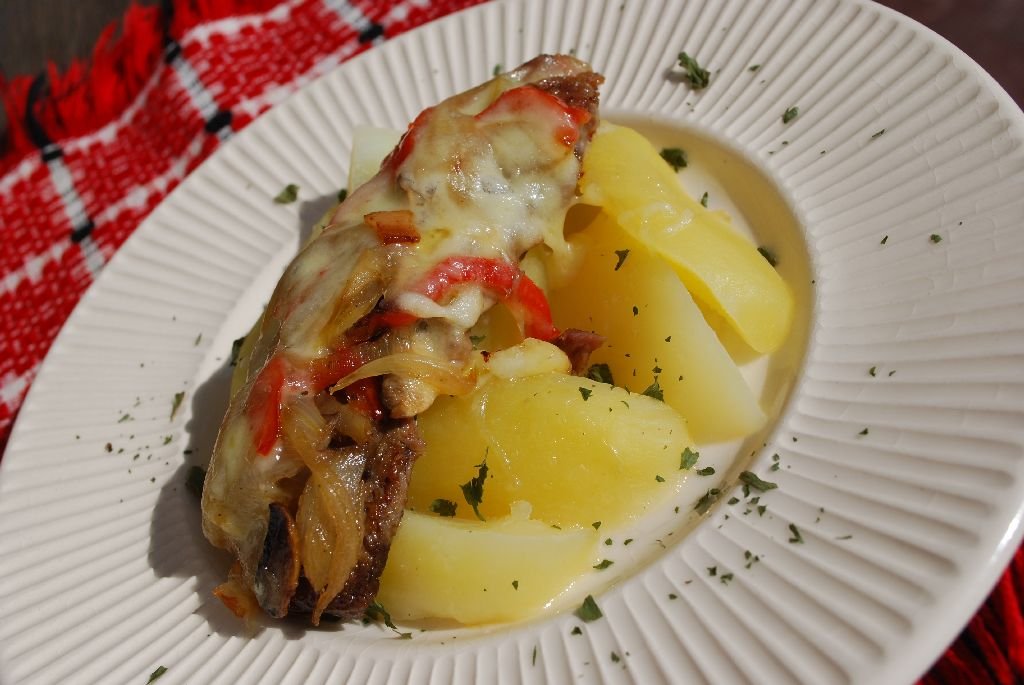 Elkészítése igen egyszerű, ellenben tény, hogy csak frissen fogyaszthatva hajlandóak az emberek mindenféle szuperlatívuszokban beszélni róla. Készülhet szárnyas vagy sertéshúsból, ám mindkettőt ajánlott sütőbe kerülésük előtt picit lepirítani. A tepsi aljában elheverve betakarózhatnak sonkával, gombával, és a művelet legvégén sajttal. Most egy kis változatosságot eszeltem ki, ugyanis összedinszteltem a szalonnát, hagymát, paprikát és gombát, majd e keveréket kanalaztam a hússzeletekre. Petrezselymes krumpli társult hozzá, meg egy jó Irsai Olivér (aki minden bizonnyal egy kellemes személy, de jelzem, pohárban sem megvetendő!).