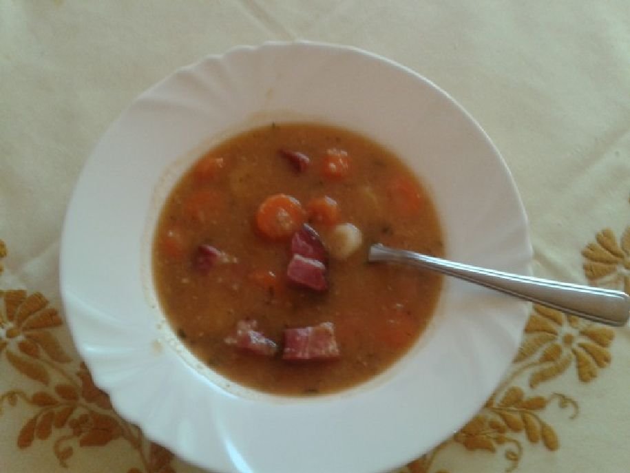 Hozzávalók: 25 dkg vörös lencse, 20 dkg füstölt tarja, 1 szál sárgarépa, 1 szál petrezselyem, 1/2 zellergumó, 3 gerezd fokhagyma, 1 fej vöröshagyma, só, bors, 2 db babérlevél, 1 ek zsír vagy olaj, 2 ek liszt, 1 ek pirospaprika, 1 ek mustár.