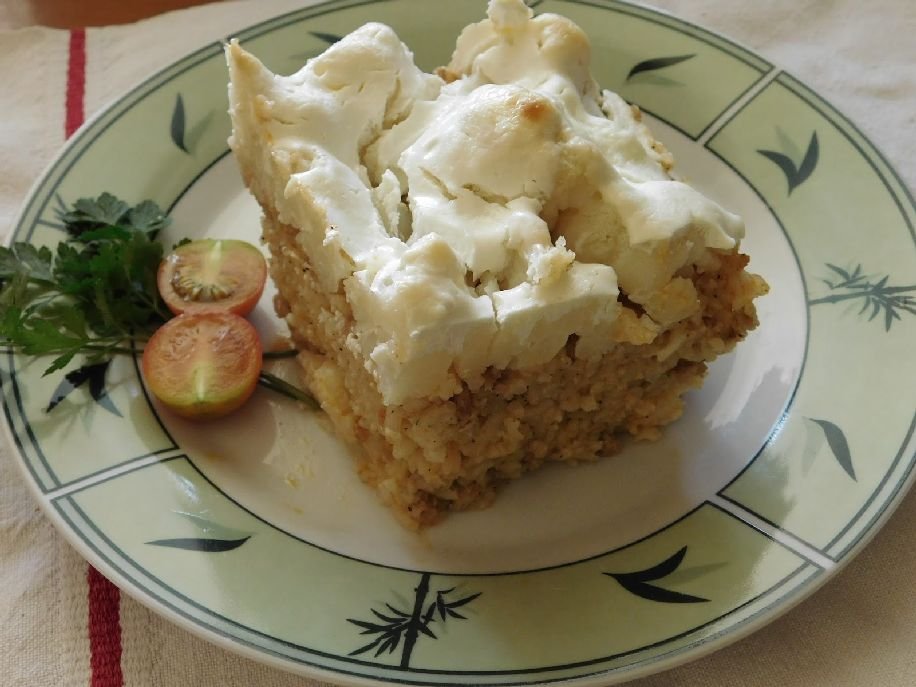 A karfiolt rózsáira szedjük, megmossuk, sós vízbe főni tesszük. A hagymát apróra vágva az olajon megpároljuk. Hozzáadjuk a darált húst, sózzuk, borssal, paprikával fűszerezzük. Mikor morzsásra párolódott, hozzáadjuk a rizst kétszeres mennyiségű vízzel. Fedő alatt hagyjuk puhára főni. A megfőtt karfiolt leszűrjük. Egy kis tepsi alját kirakjuk a fél karfiollal (kisebb darabokra szedve), ráborítjuk a rizses húst, a tetejére kerül a karfiol másik fele. Jó sok tejfölt kenünk rá, és mehet is a sütőbe. Mikor kezd a tetején pirulni a tejföl, kivesszük. (gerdisuti.blogspot.com)