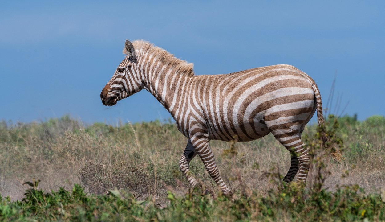 Egy igen ritka, szőke zebrát sikerült megörökíteni a Serengeti Nemzeti Parkban. A felfedezés azt jelenti, hogy az efféle példányok képesek elboldogulni a vadonban is.