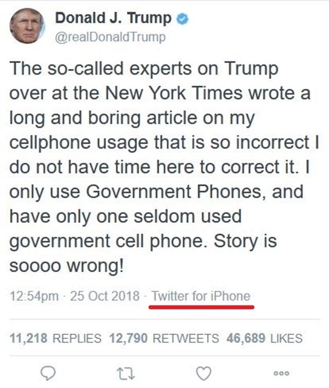 Regisztrált felhasználónak sem kell lenni, hogy valaki ellenőrizze, milyen készülékről írta bejegyzését az adott személy, a mikroblog ugyanis lehetőséget ad erre. Trump esetében is látható, milyen rendszerről közli mondandóit, mint tette azt a New York Times-t bíráló bejegyzésekor is: