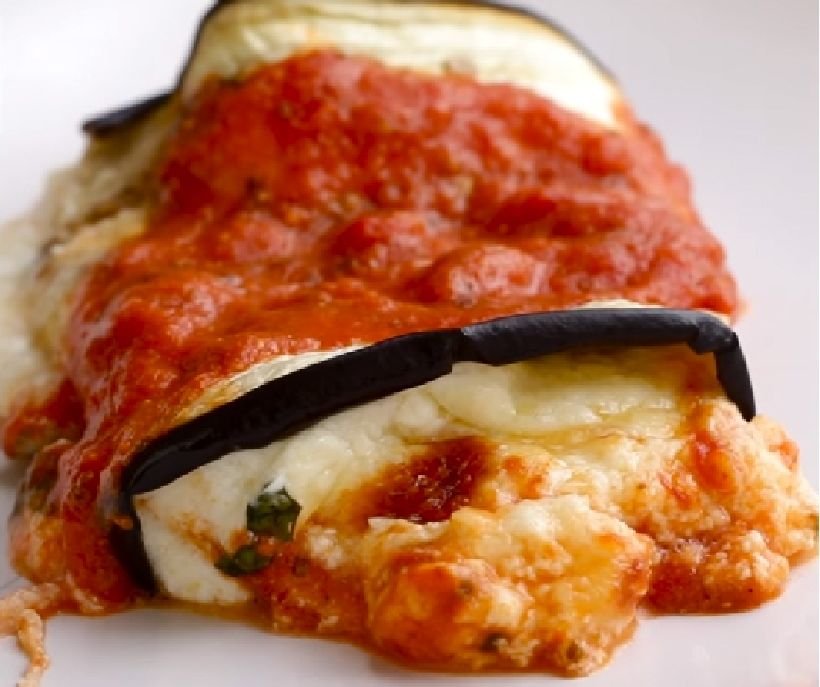 Elkészítés: a padlizsánokat késsel vagy zöldséggyaluval hosszában kb. 3 mm-es szeletekre vágjuk. Serpenyőben (vagy akár grillen is mehet) a padlizsánok mindkét oldalát átsütjük, mindegyik adag előtt cseppnyi olajat vagy vajat téve a serpenyőbe, amíg enyhén áttetszős, rózsaszínes-halványbarnásra sülnek. Papírtörlőre kiszedjük, és hűlni hagyjuk, ezalatt tekerhetővé is puhulnak. A zöldségeket apróra vágjuk, majd (a paradicsomot lehetőleg a lédúsabb belső magrész nélkül) aprítógépben kissé pépesre aprítjuk, hozzáadjuk a fűszereket. Szitán lecsorgatjuk, illetve kicsit kinyomkodjuk, mert a paradicsom sok levet ereszt. A padlizsánszeleteket megkenjük a zöldségkrémmel, egyik végükbe teáskanálnyi krémsajtot teszünk, és feltekerjük. Jénaiba vagy tepsibe tesszük, és sütőben átsütjük, bár ez a lépés akár el is hagyható. (www.nosalty.hu)