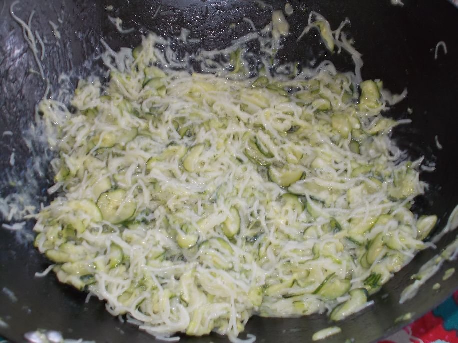 Hozzávalók: 4 kis cukkini, 2 gerezd fokhagyma, 150–200g ementáli sajt, rizstészta, vaj, só, bors.