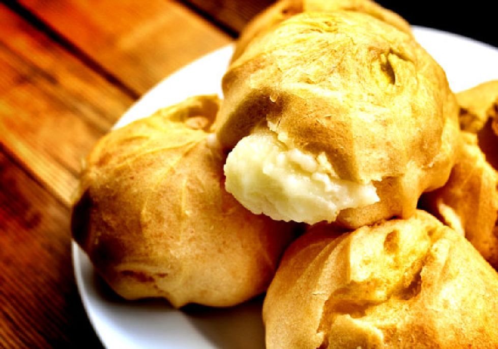 A tésztához forraljuk fel a vizet az olajjal, majd gyors mozdulatokkal keverjük hozzá a lisztet és a sót is, ügyelve, hogy csomómentes legyen. Addig keverjük, amíg elválik az edény falától. Ha ez megtörtént, vegyük le a tűzről, és folyamatos keverés mellett üssük hozzá a négy tojást is, majd keverjük az egészet egységes tésztává. A sütőt melegítsük elő 210 fokra, és az aljában helyezzünk el egy vízzel megtöltött, hőálló edényt. A masszát töltsük habzsákba, és egy sütőpapírral bélelt tepsire nyomjunk egységes méretű halmokat, majd süssük aranybarnára. Közben készítsük el a tölteléket: a reszelt sajt nagyobbik részét dolgozzuk össze a többi hozzávalóval. A tej csak akkor kell, ha túl sűrűnek találjuk a kapott krémet. Mikor megsültek a golyók, vágjuk félbe és töltsük meg a krémmel és némi reszelt sajttal. (www.femina.hu)