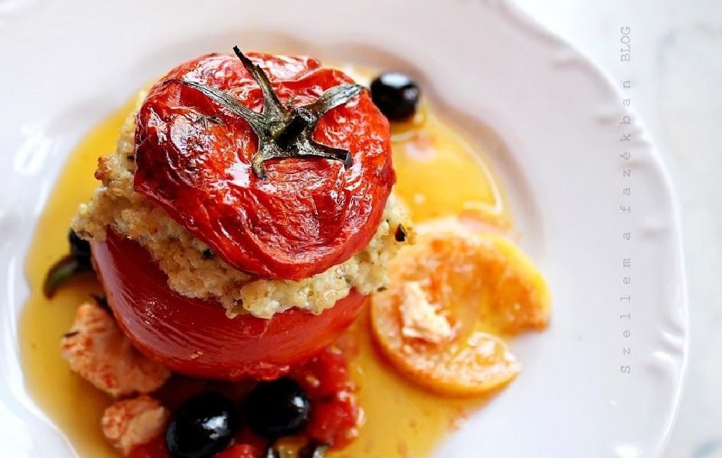 A megpuhult köleshez kevertem a darabokra morzsolt feta nagy részét, a szeletelt olajbogyó felét, az aprított zöldfűszerek nagy részét is, majd betöltöttem a paradicsomokba, amiket a tálba sorakoztattam. Köréjük szórtam a megmaradt fetát, olajbogyót, fűszereket és a paradicsomok kalapját is kissé megcsepegtettem olívaolajjal, s mehetett is a sütőbe, olyan 200-220 fokra. (http://szellemafazekban.blogspot.ro)