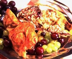 Előkészítés: lábasban felforrósítjuk az olajat, beletesszük a rizst, üvegesre futtatjuk, majd megszórjuk az ételízesítővel, a curryvel, felöntjük dupla mennyiségű vízzel, és lefedve lassú tűzön kb. 15 percig pároljuk. Levesszük a tűzről, és kihűtjük. A csirkét megmossuk, kívül-belül konyhai törlővel szárazra töröljük, bedörzsöljük sóval, borssal. A szőlőt megmossuk és leszemezzük. A sütőt 180 fokra (gázsütő 2. fokozata) előmelegítjük. A kihűlt rizshez hozzáadjuk a szőlő egyharmadát mindkét fajtából, beleütjük a tojást, és jól összekeverjük. A szőlős rizzsel megtöltjük az előkészített csirkét, és hústűvel összetűzzük, vagy összevarrjuk. Tepsibe tesszük, kevés vizet öntünk alá, alufóliával lefedjük, és kb. 50 percig sütjük. Ezután levesszük az alufóliát, és kb. 15 perc alatt ropogós pirosra sütjük. Kivesszük a sütőből, és 10-15 percig állni hagyjuk, hogy szépen tudjuk vágni. Amíg a csirkét pihentetjük, serpenyőben felforrósítjuk a margarint, beledobjuk a maradék szőlőt és hirtelen, nagylángon, rázogatva kb. 2-3 percig pároljuk. Feldaraboljuk a csirkét, és a szőlővel körítve tálaljuk. (www.mindmegette.hu)