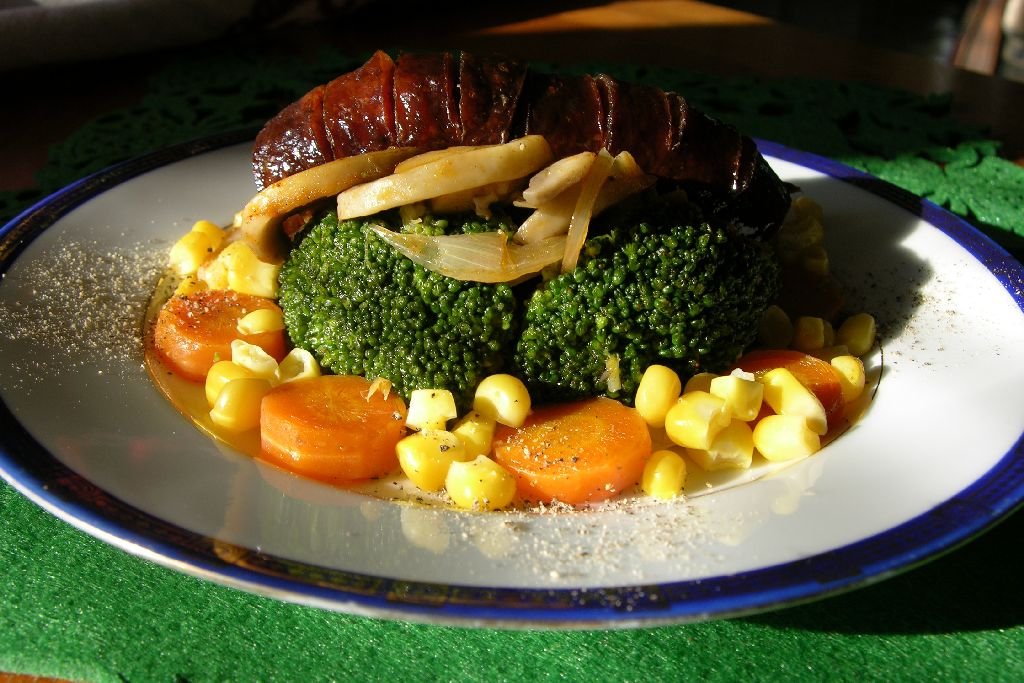 Ha lapul a fagyasztóban egy zacskó fagyasztott zöldség, a hűtőben pedig egy kis kolbász, akkor pár perc alatt elkészíthető, és fogyasztható ez a finom eledel. Pici olajon (sült szalonnakockák társasága az élvezeti szintet jócskán emeli) megpárolok egy fej felszeletelt hagymát, majd hozzáteszem a többi zöldséget. A kolbászt szép pirosra sütöm, mindkét oldalán. Végezetül egy igazán finom ebéd zsírját semlegesítem némi gin-tonikkal (vagy fordítva, manó érti a kémiát!), rosszabb esetben egy hátszeles biciklitúrával.