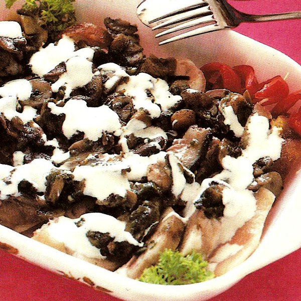 Hozzávalók: 1 db sertéscsülök, 20 dkg gomba, 1 mokkáskanál bors, 1 csokor petrezselyemzöld, 15dkg füstölt sonka, 1 fej hagyma, 4 gerezd fokhagyma, 2 dl tejföl, 1/2 dl mustár, 1 ek olaj.