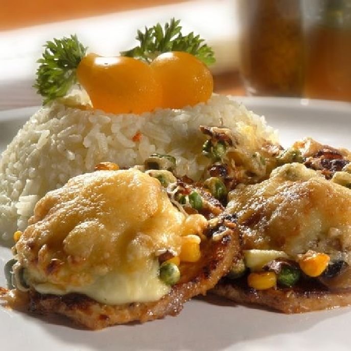 A húst kicsit kiklopfoljuk, sózzuk, borsozzuk. Elősütjük kevés olajon pár másodpercig, majd kevés olajjal kikent tepsibe rakjuk. A zöldborsót, a kukoricát, a gombát sózzuk, borsozzuk, petrezselyemzölddel összekeverjük. Ráhalmozzuk a húsra, majd besamelt készítünk, amibe tehetünk borsot és petrezselyemzöldet is. Rátesszük a zöldségek tetejére, majd reszelt sajttal megszórjuk. 15–20 percig sütjük, párolt rizzsel tálaljuk. (www.mindmegette.hu)