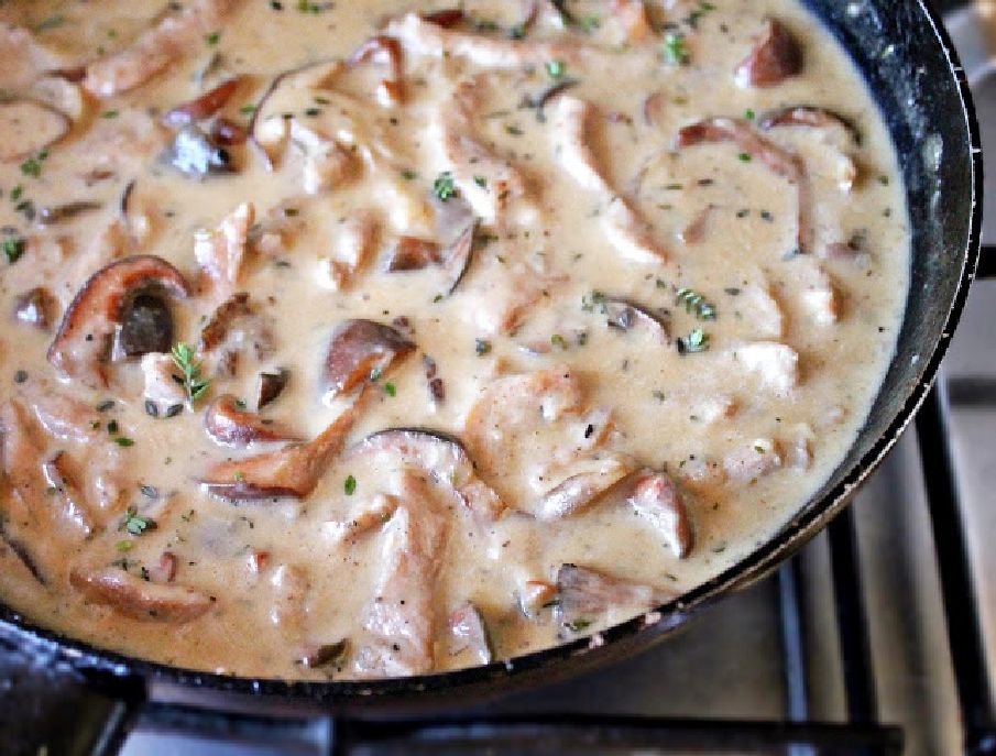 Hozzávalók (4 főre): 60 dkg karaj, 0,5 kg rizike vagy más erdei gomba, 20 dkg vargánya, 1 közepes fej vöröshagyma, 2 gerezd fokhagyma, 5 dkg vaj, 1 ek hidegen sajtolt repceolaj, só, frissen őrölt bors, 2 tk gombapor, citromos kakukkfű, 1 szem szegfűszeg, 1 picike fahéj, 1,5 dl tejszín, 1 csapott ek liszt.