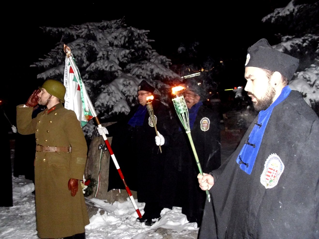 A Magyar Férfidalárda jóvoltából felcsendülő, korabeli katonanóták elhangzása után a jelenlévők fáklyás menete a templomkertbe vonult, ahol a vitézi rendek képviselői megkoszorúzták a hősök emlékművét.