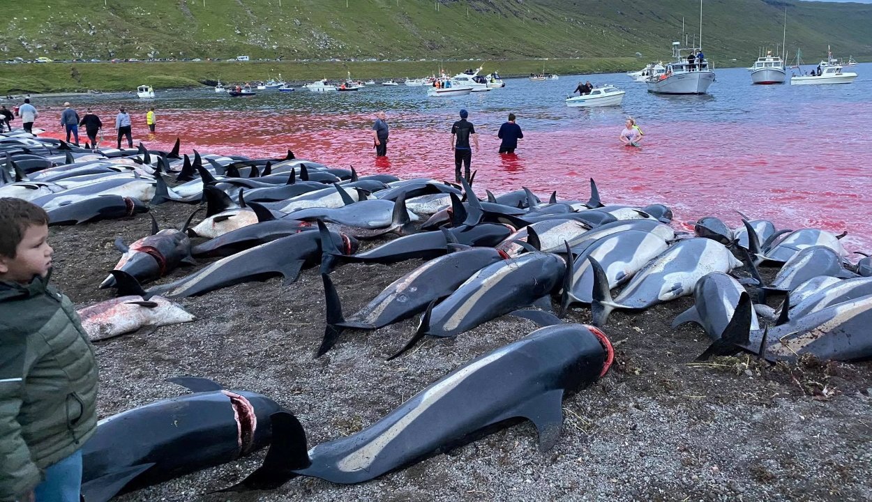 A Sea Shepherd környezetvédelmi szervezet egy hosszú videót tett közzé a Facebookon, ezen látható, ahogy férfiak kirángatják az állatokat a partra a vértől vörössé vált vízből. A szervezet szerint ez a legnagyobb csoport tengeri emlős, amelyet valaha egyetlen akció során megöltek a Feröer-szigeteken.