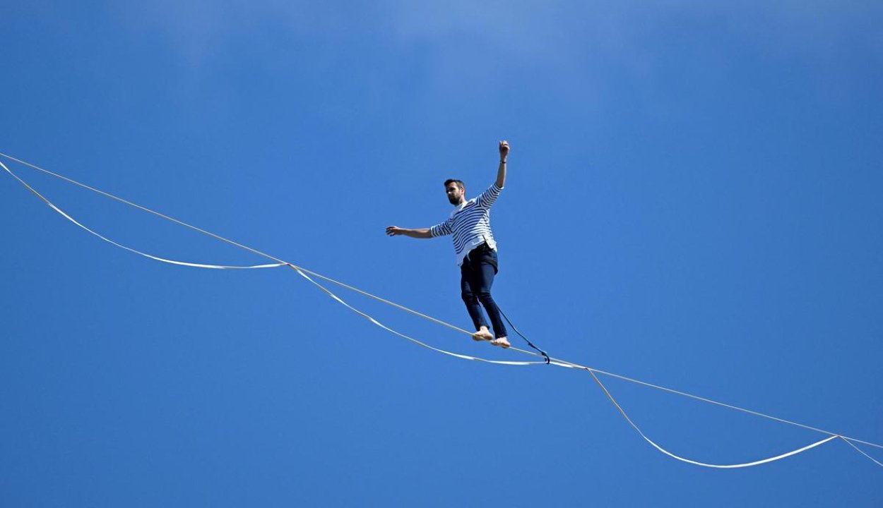 Rekordot döntött egy vakmerő francia kötéltáncos. A férfi több mint két kilométert tett meg a száz méter magasan kifeszített kötélen, aminek egyik felét a normandiai partoknál található Mont Saint-Michel-apátsághoz rögzítették.